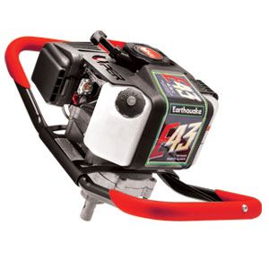 With its compact design, yet powerful output, this one-man earth auger powerhead takes the work out of hard digging. Whether it's a deck, fencing, planting trees or installing a mailbox - you're sure to find a mutliple uses around your property for the E4. Features: -Steel muffler guard. -Augers are available in 2", 3", 4", 6", 8", and 10" diameters and are ordered separately. -Viper engine on the E43 starts with ease thanks to a direct inject primer and choke system. -Wrap around foam grip anti-vibration handlebars provide additional comfort when drilling. -E43 powerhead from Earthquake, the worlds best selling earth auger powerhead. -Easy-to-grip fingertip throttle control. -Solid steel, heat-treated alloy gears. -See-through gas tank. -Anti-vibration foam grip handlebars. -Quick start primer. -Assembly required. Specifications: -2-cycle 43 cc Viper Engine. -250 Maximum auger RPM. -Weight 19 lbs. -Gear ratio 30:1.